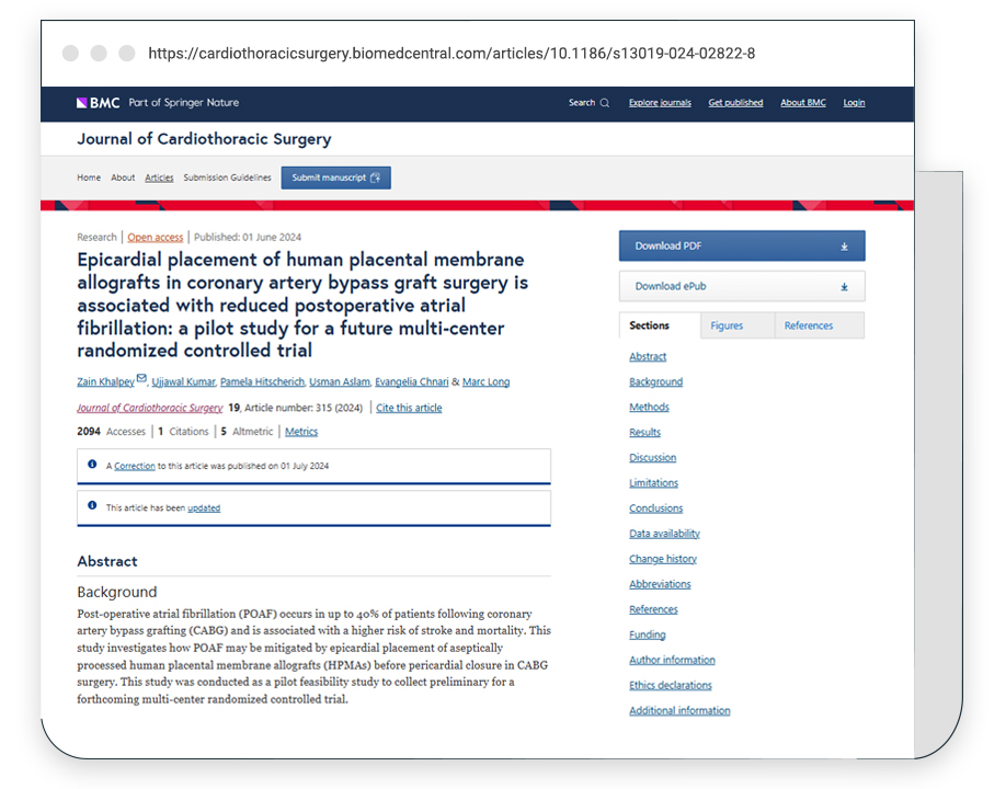 BioXtek’s regenerative solutions leverage cutting-edge biotechnology derived from human placental membranes, meticulously processed and scientifically proven to deliver optimal clinical outcomes, particularly in cardiac surgical applications. Our approach is uniquely tailored to meet the rigorous standards and expectations of cardiac surgeons.